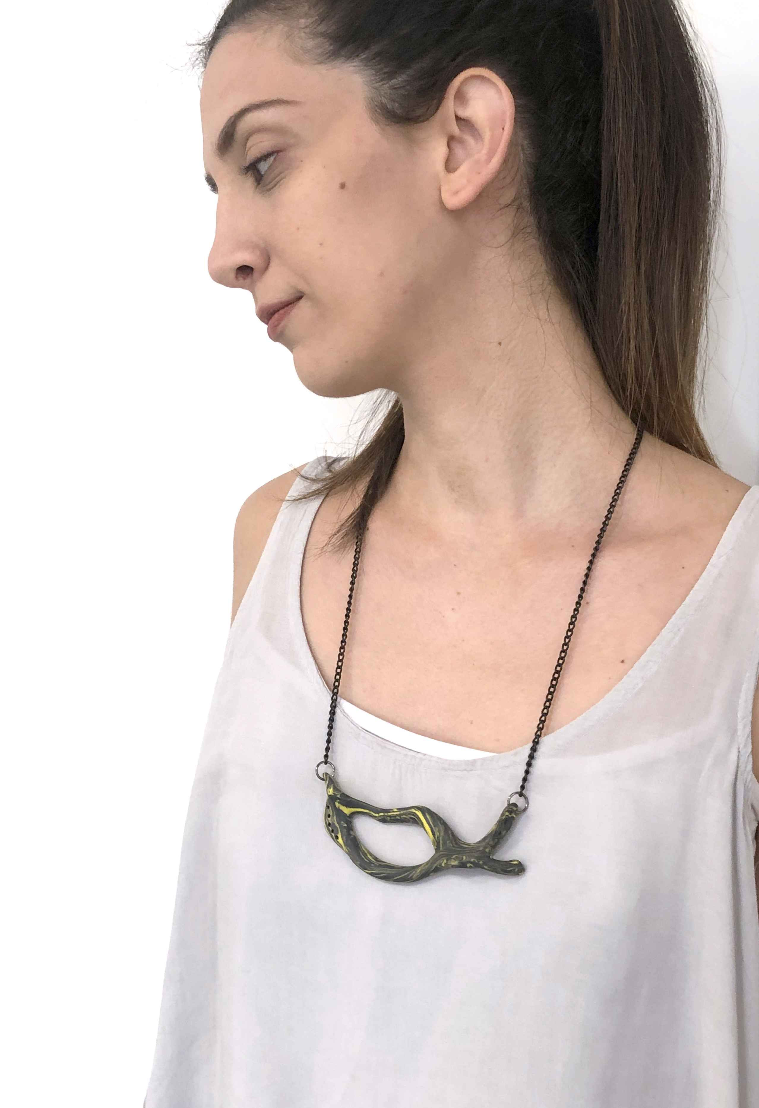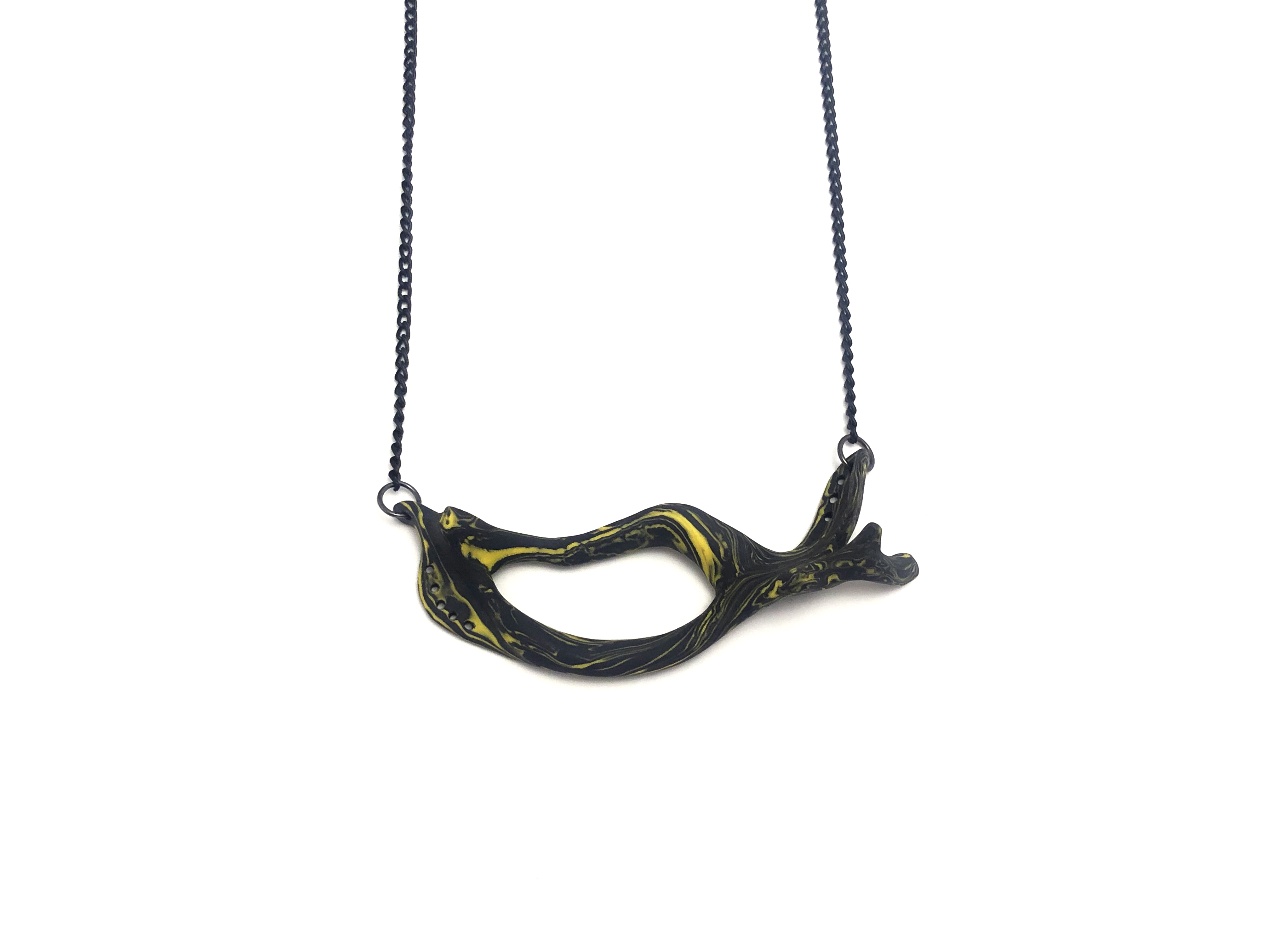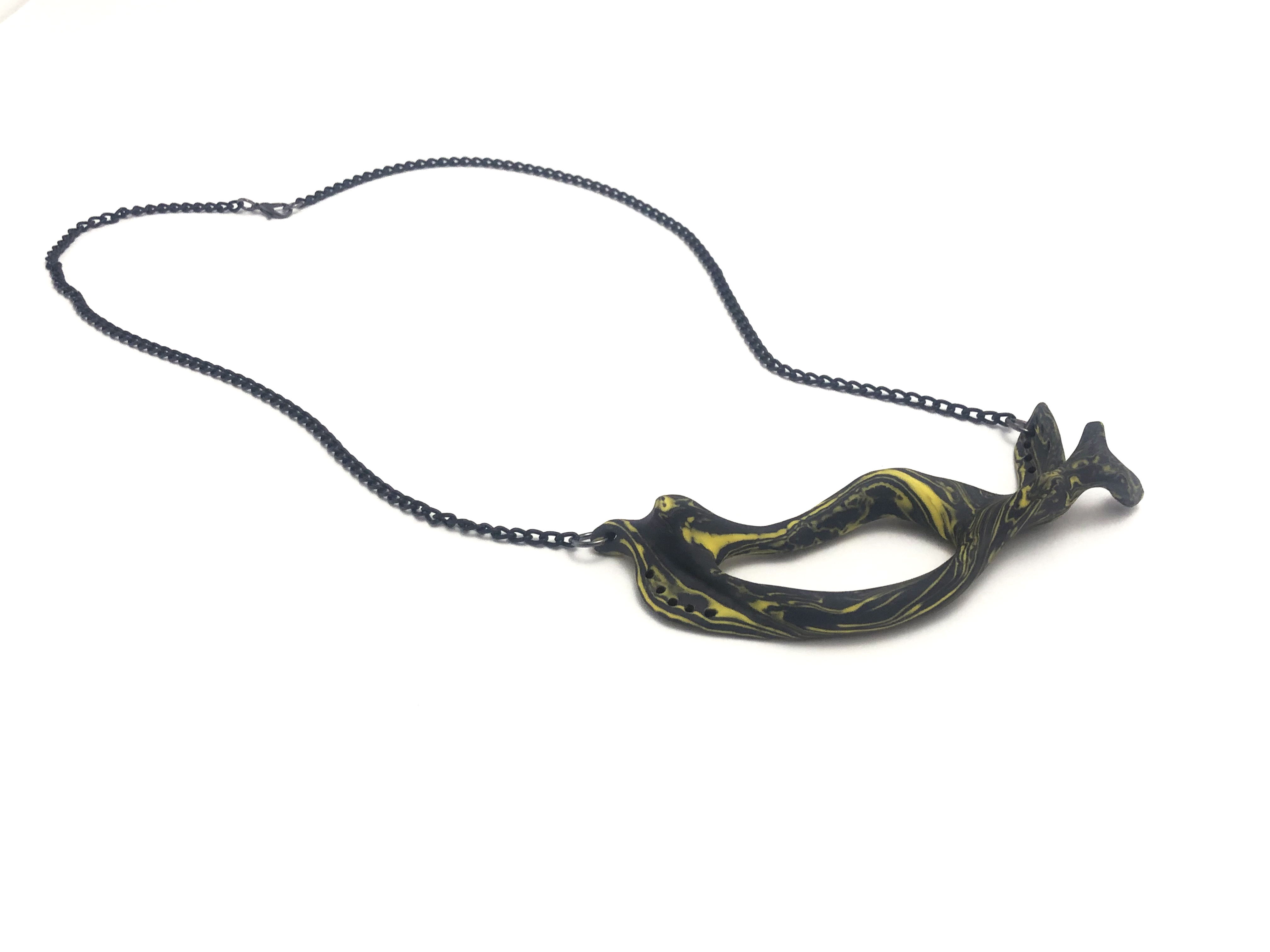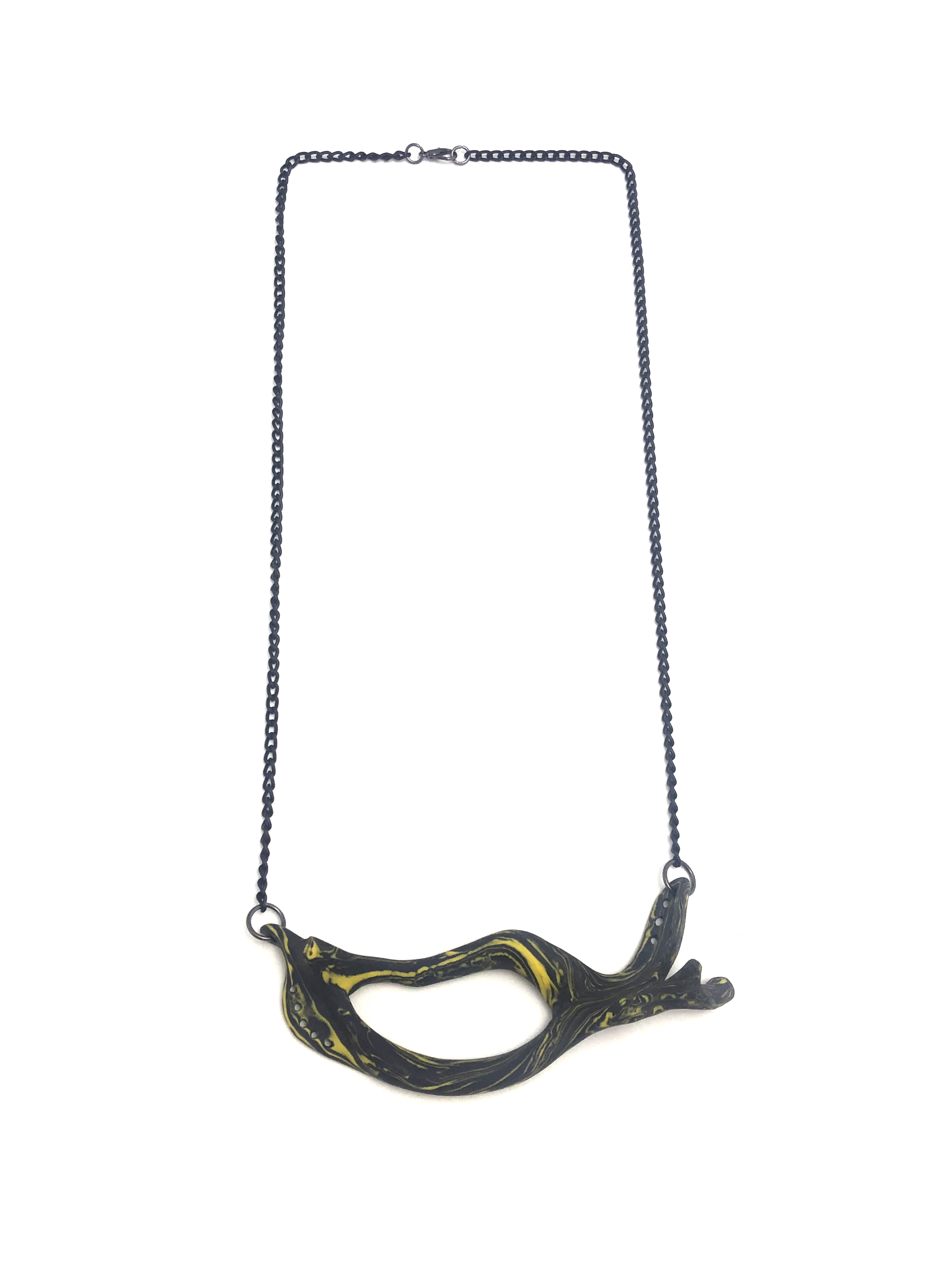 Γλυπτό κολιέ με μαύρη και κίτρινη πορσελάνη και μαύρη αλυσίδα αλουμινίου.