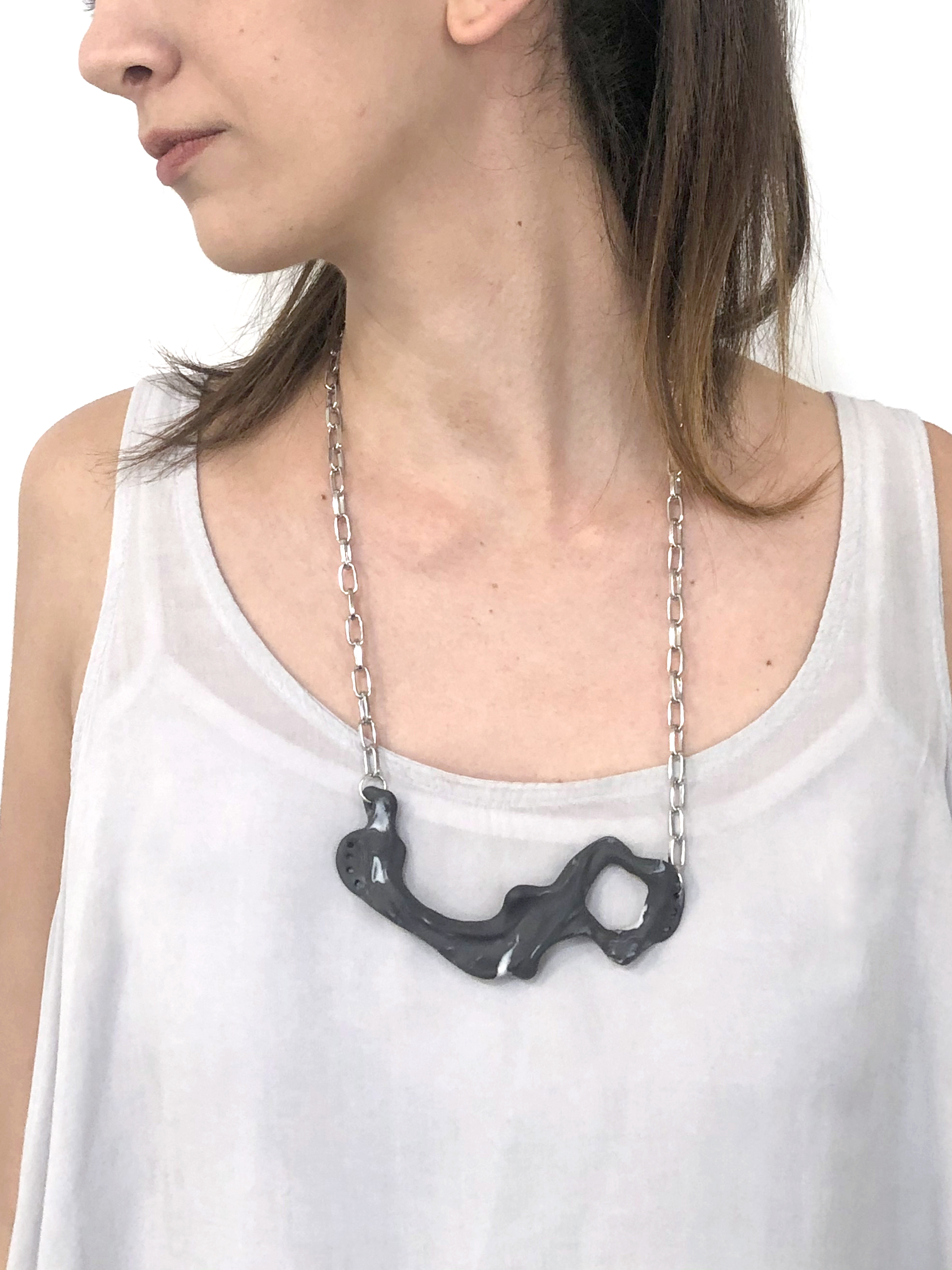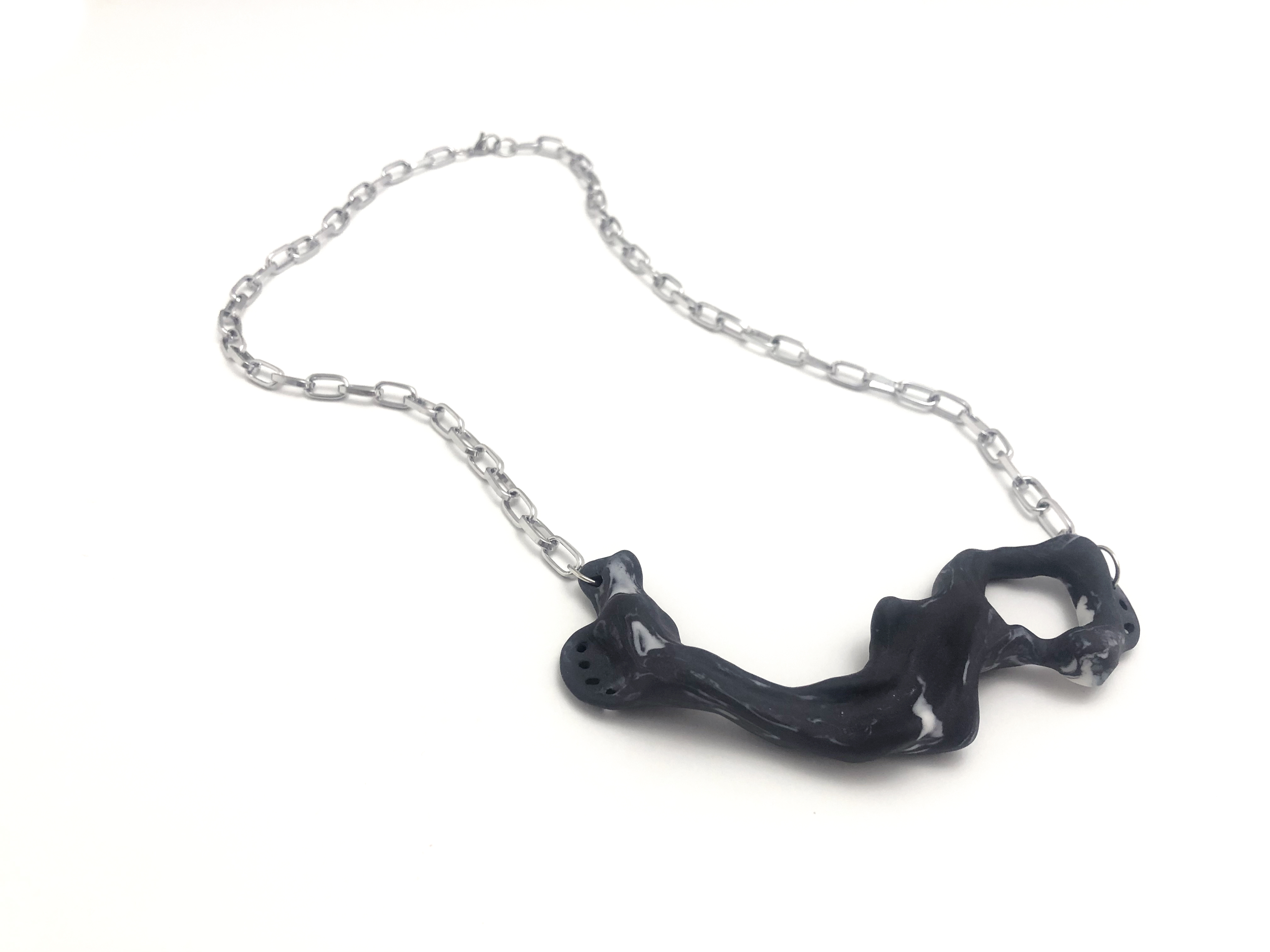 Γλυπτό κολιέ με μαύρη και λευκή πορσελάνη με ασημί αλυσίδα αλουμινίου.